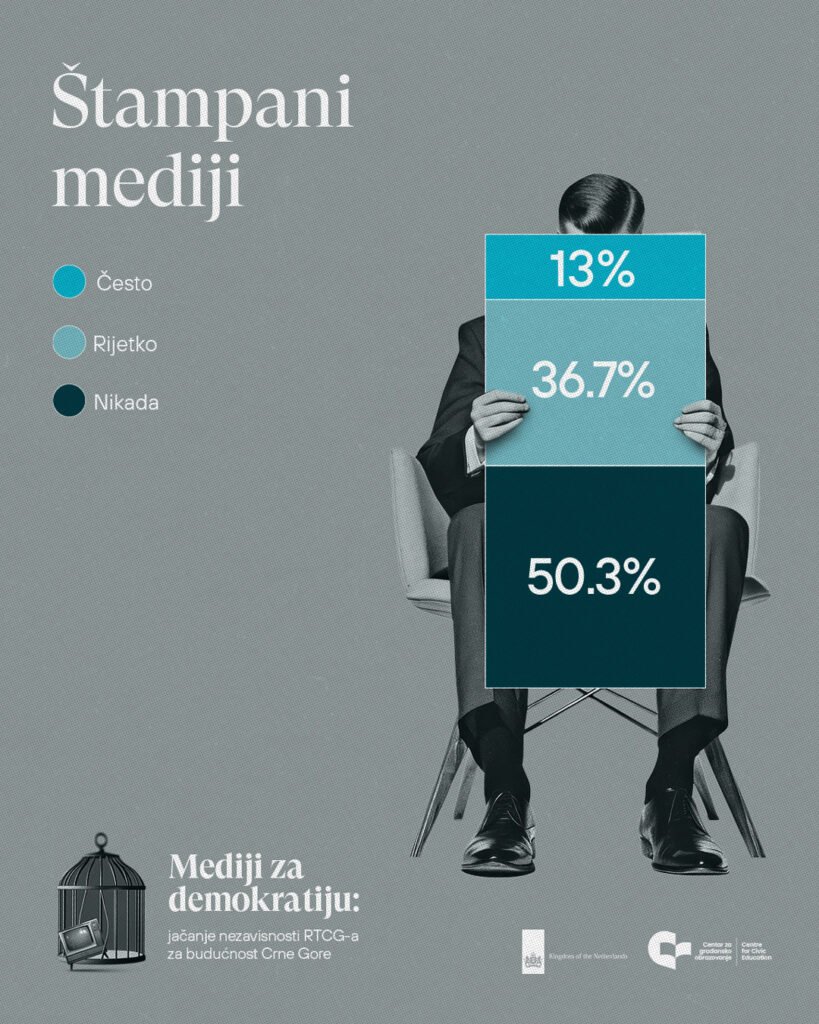 Tradicionalni mediji nastavljaju da gube publiku. Štampu uopšte ne prati 50,3% građana, dok je 19,6% prati veoma rijetko, što ukazuje na nastavak pada interesovanja. Radio 28% građana i građanki prati rijetko, a 24,2% veoma rijetko, dok je udio onih koji ga prate često ili veoma često dodatno smanjen. Televizija, iako i dalje prisutna u svakodnevici značajnog dijela javnosti, takođe bilježi pad – 28,5% građana i građanki je prati često, a 21,5% veoma često, što je manje nego u 2024. godini.