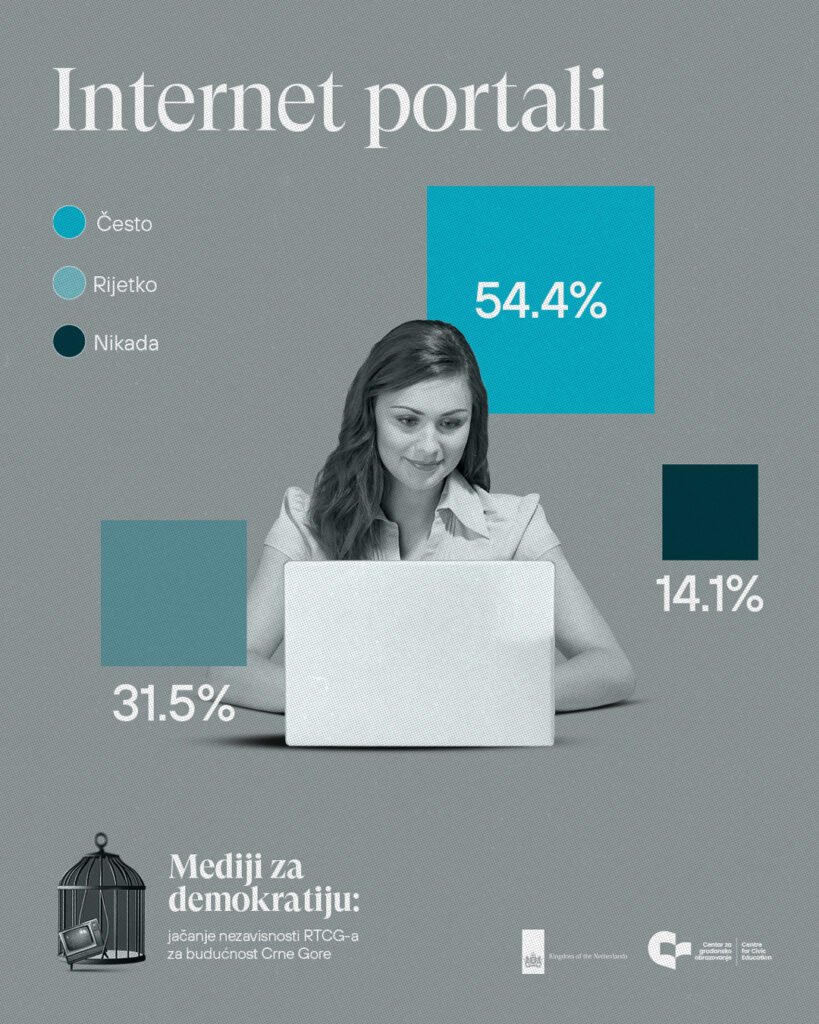 Za razliku od društvenih mreža, internet portali bilježe rast učestalosti praćenja. U 2025. godini, 32,7% građana i građanki navodi da portale prati često, a 21,7% veoma često. Posebno je značajan pad broja onih koji portale uopšte ne prate – sa 20,7% u 2024. na 14,1% u 2025. godini, što potvrđuje njihovo jačanje kao centralnog izvora informacija, naročito za dnevne i aktuelne teme.