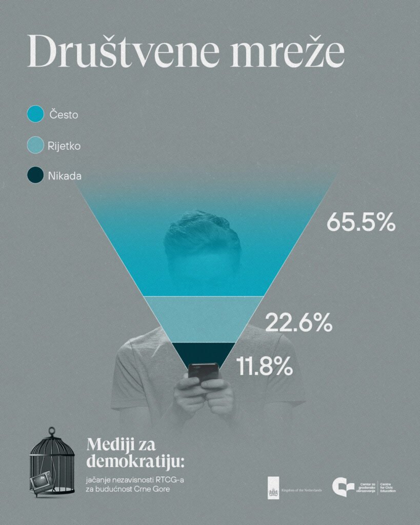 Društvene mreže su i tokom protekle godine ostale najintenzivnije korišćen medij. U 2025. godini, 34,8% ispitanih navodi da ih prati veoma često, dok 30,7% to čini često. U odnosu na 2024. godinu, kada je 40,1% veoma često pratilo društvene mreže, bilježi se pad najintenzivnijeg korišćenja, uz istovremeni rast udjela onih koji ih prate rijetko, što ukazuje na promjenu navika i mogući zamor publike.