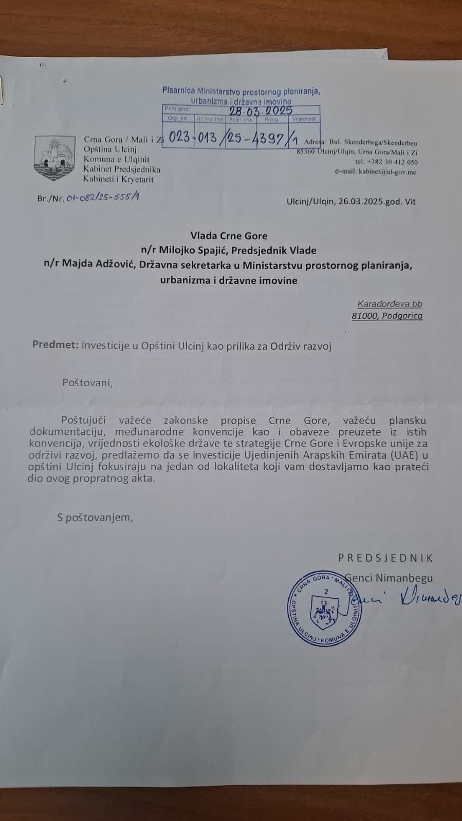 Dokument upućen Vladi Crne Gore, Ministarstvu prostornog planiranja, urbanizma i državne imovine, a koji ekskluzivno objavljuje Pobjeda, inicira ponudu investicija Ujedinjenih Arapskih Emirata u Ulcinju.