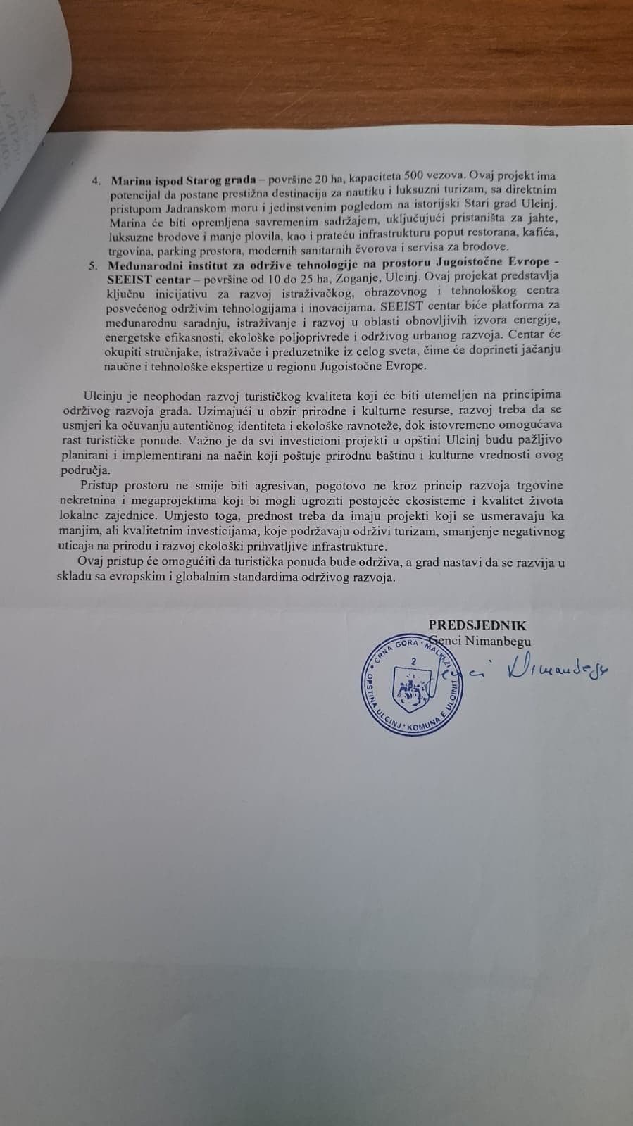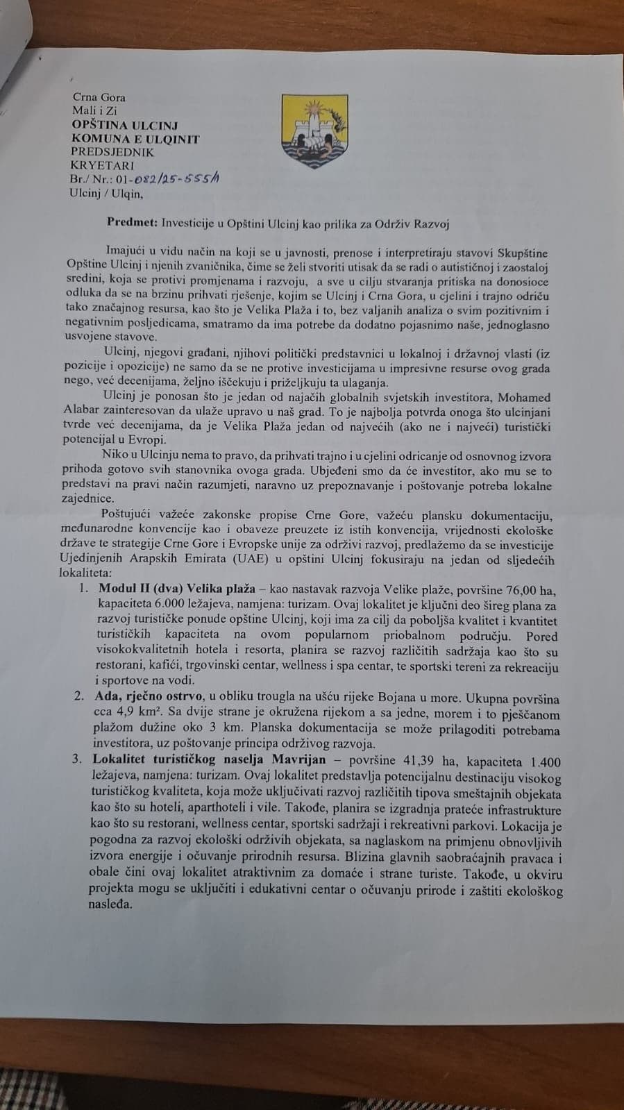 – Ulcinj, njegovi građani, njihovi politički predstavnici u lokalnoj i državnoj vlasti (iz pozicije i opozicije) ne samo da se ne protive investicijama u impresivne resurse ovog grada nego, već decenijama, željno iščekuju i priželjkuju ta ulaganja – precizira se u pismu u kojem se u pozitivnom kontekstu direktno pominje i investitor iz UAE.